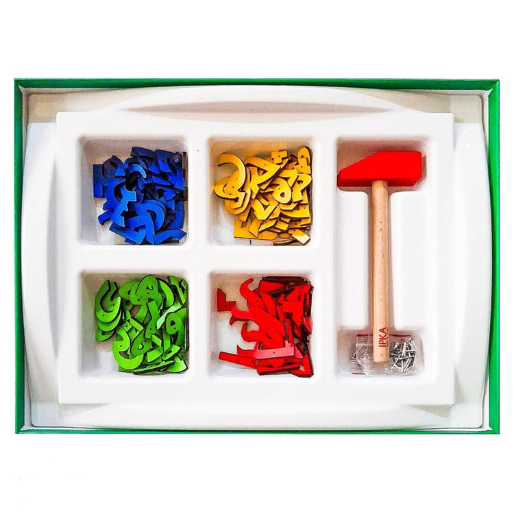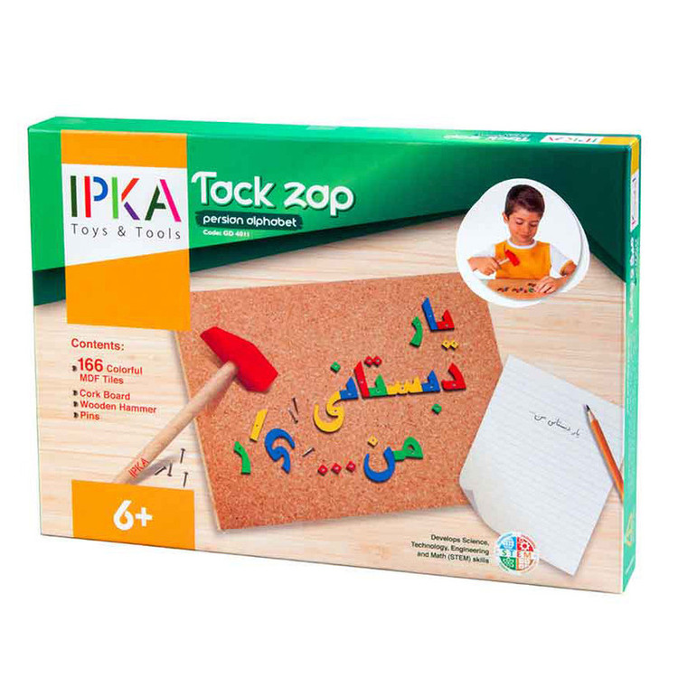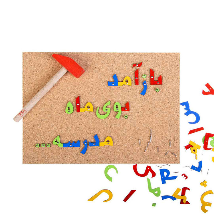 بازی میخ و چکش الفبای فارسی ایپکا با هدف تسهیل آموزش الفبا به کودکان طراحی و تولید شده است. استفاده از میخ و چکش برای کوبیدن حروف رنگارنگ فارسی بر روی صفحه ی چوب پنبه ای مهارت دست ورزی را در کودک تقویت می کند و در کنار بازی، تمرین دیکته را برای او به تجربه ای شیرین تبدیل می نماید.