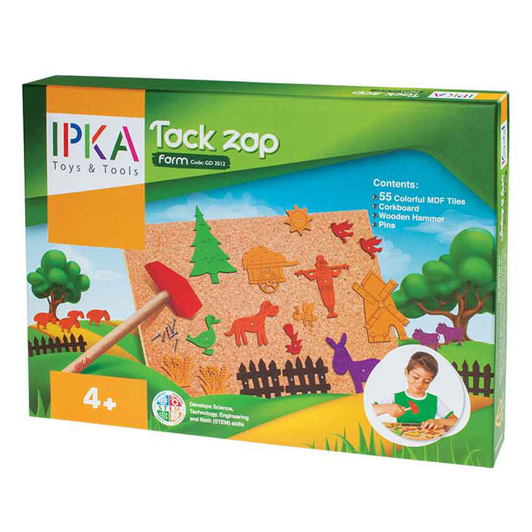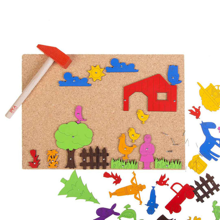 میخ و چکش مزرعه یکی از مجموعه بازی های میخ و چکش ایپکا با اشکال آماده مزرعه مانند حیوانات، پرندگان، درخت ، کلبه و ..است. دراین محصول کودک می آموزد که چگونه با استفاده از میخ وچکش، مزرعه زیبای خود را بسازد. او در ذهن خلاق خود مزرعه ای را تصویرسازی کرده و با کمک اشکال رنگارنگ موجود در بسته آن ها را بر روی صفحه چوب پنبه ای می کوبد و طرح زیبای خود را خلق می کند.