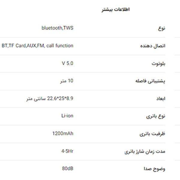 اگر شما هم از آن دسته افرادی هستید که هنگام انجام دادن کارهای روزمره یا هنگام کار و تفریح عادت به گوش کردن به موسیقی دارید، اسپیکرهای پرتابل گزینه ی مناسبی برای شما خواهند بود. این اسپیکرها به دلیل وزن و اندازه ی مناسب حمل آسانی دارند، از این رو برای دوست داران موسیقی از لوازم ضروری ای به شمار می آیند که در موقعیت های مختلف میتوانند به همراه خود داشته باشند و از گوش سپردن به موسیقی لذت ببرند. اسپیکر تسکو مدل TS 23030 در ابعاد 8.9x25x22.6 سانتی متر،وزن 471 گرم در رنگ مشکی عرضه شده.این محصول از طریق بلوتوث،پورت USB،درگاه TF CARD و درگاه AUX قابل اتصال و پخش موسیقی است، همچنین رادیو FM را نیز پشتیبانی میکند. بهره مند از نسخه بلوتوث 5.0 و برد 10 متری،مجهز به فناوری TWS و دارای قابلیت پاسخگویی به تماس های ورودی شما است. باتری این محصول از نوع لیتیوم یون 1200 میلی آمپری است که در مدت زمان 4 الی 5 ساعت فول شارژ میشود.توان واقعی این محصول 5x2 وات با وضوح صدای 80DB میباشد. اقلام همراه اسپیکر تسکو مدل TS 23030 شامل یک کابل USB،کابل AUX ، دفترچه ی راهنما و یک بند برای حمل هرچه راحتتر اسپیکر میباشد.