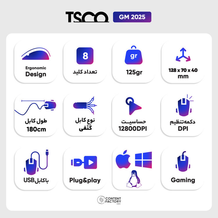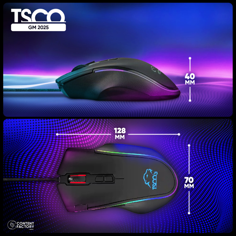 ماوس گیمینگ تسکو مدل GM 2025 یک ماوس حرفه ای مخصوص بازی است. بدنهی این ماوس به گونهای ساخته شده که امکان استفاده از آن با هر دو دست وجود دارد و گیمرهای چپدست هم میتوانند از یک ماوس خوشساخت و خوش دست بهرهمند شوند. این طراحی خاص باعث میشود گیمرهای حرفهای بتوانند با ماوس گیمینگ GM 2025 در بازههای طولانی و بدون خستگی مچ دست به انجام بازیهای کامپیوتری بپردازند. این ماوس قادر است در حداکثر دقت 12800 نقطه بر اینچ (DPI) کار کند؛ البته میتوان در زمان دلخواه با فشردن یک دکمه، بین دقتهای مختلف ماوس جابهجا شد و حتی رزولوشن 250dpi را انتخاب کرد. روی بدنهی ماوس GM 2025، هشت عدد کلید قابلبرنامهریزی وجود دارد که به کمک آنها میتوان کارهای خاصی را درون محیط سیستمعامل یا بازیهای کامپیوتری انجام داد.قابلبرنامه ریزیبودن کلیدها به این معناست که میتوان از طریق برنامهی اختصاصی تسکو تعیین کرد که هر کلید چه کاری باید انجام دهد. مورد قابلتنظیم دیگر، نورپردازی بدنهی ماوس است. شما میتوانید از طریق درایور، رنگی را که میخواهید روی بدنهی ماوس به نمایش درآید، تعیین کنید هر 7 کلید چه کاری را برایتان انجام دهد و تنظیمات دلخواهتان را روی برنامه آن ذخیره کنید و در هر مکان و زمانی، بهسرعت این تنظیمات را فراخوانی کنید و حسی مشابه حس بودن در خانه را داشته باشید. رابط اتصال ماوس به کامپیوتر، پورت USB است و با اغلب نسخههای سیستمعامل ویندوز سازگاری دارد.