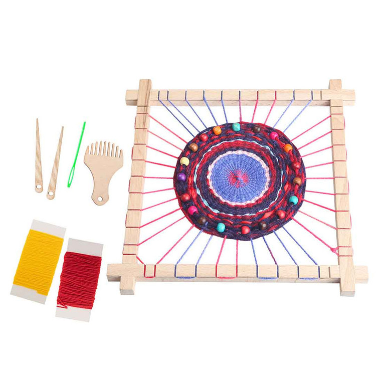- دار بافندگی چوبی ، شانه ، 2 عدد سوزن چوبی ، سوزن پلاستیکی ، 20 عدد مهره چوبی ، 2 رنگ کاموا و دفترچه راهنما