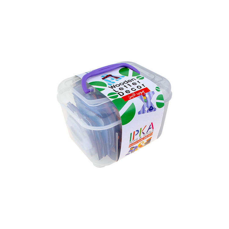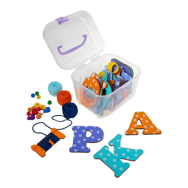 حروف انگلیسی توسط نخ و مهره و قطعات رنگی در کنار هم قرار می گیرند تا کلمه و جمله مناسب با آن ها ساخته شود